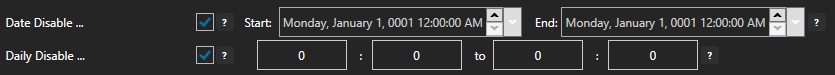 Checking the Date Disable… box brings up Start and End fields; use these to disable an alarm for a date/time range. Checking the Daily Disable… box brings up hour and seconds fields; use these to disable an alarm for a certain time period each day.