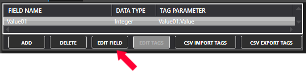Add a data field and specify the Tag Parameter, field name, and field data type use the Add Button.